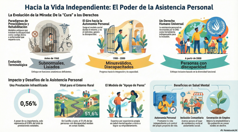 También pone el foco en una herramienta clave: la asistencia personal. Frente a una mirada que reduce todo al “cuidado” y a la dependencia, la asistencia personal se entiende como una inversión en autonomía, libertad y proyecto de vida. En España, el movimiento se ha ido articulando en redes, espacios de apoyo mutuo y oficinas de vida independiente, y ha ido ganando reconocimiento en el marco legislativo y social.